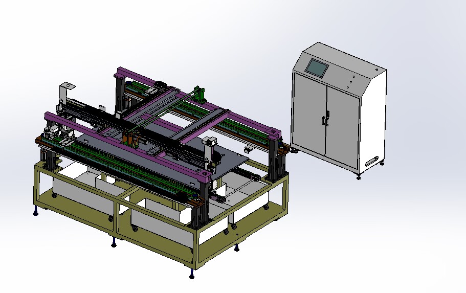 自動排版機(jī)的主要功能單元有:玻璃輸送定位系統(tǒng)、抓取行走系統(tǒng)、視覺檢測系統(tǒng)、電控系統(tǒng)等;通過以上功能單元,實現(xiàn)了將自動串焊機(jī)串焊好的電池串,按照工藝尺寸要求和排版方向順序自動排版鋪設(shè)到玻璃(EVA已經(jīng)鋪設(shè))上,組成電池串陣列。玻璃/EVA通過傳輸線傳輸至指定位置,機(jī)械手抓取電池串實現(xiàn)CCD定位、自動旋轉(zhuǎn)、自動排版功能。設(shè)備通過同步帶傳輸與自動生產(chǎn)線對接,實現(xiàn)了自動流水作業(yè)。
